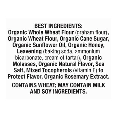 INGREDIENTS: Best Ingredients: Organic Whole Wheat Flour (Graham Flour), Organic Wheat Flour, Organic Cane Sugar, Organic Sunflower Oil, Organic Honey, Leavening (Baking Soda, Ammonium Bicarbonate, Cream of Tartar), Organic Molasses, Organic Natural Flavor, Sea Salt, Mixed Tocopherols, (Vitamin E) to Protect Flavor, Organic Rosemary Extract.