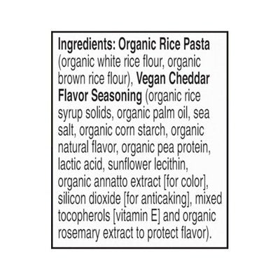 INGREDIENTS: Organic Rice Pasta (Organic White Rice Flour, Organic Brown Rice Flour), Vegan Cheddar Flavor Seasoning (Organic Rice Syrup Solids, Organic Palm Oil, Sea Salt, Organic Corn Starch, Organic Natural Flavor, Organic Pea Protein, Lactic Acid, Sunflower Lecithin, Organic Annatto Extract (for Color, Silicon Dioxide [for Anticaking], Mixed Tocopherols [Vitamin E] and Organic Rosemary Extract to Protect Flavor).