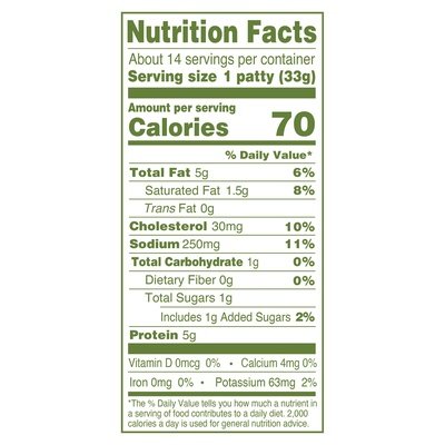 PRODUCT DETAILS: Approx. 14 fully cooked & browned patties. Certified Gluten free. gfco.org. Gluten & casein free. Applegate Naturals (Minimally processed. No artificial ingredients). Chicken raised with no antibiotics ever (Chicken never administered antibiotics or fed animal by-product). No nitrates or nitrites added. Applegate humanely raised (Chicken raised on vegetarian feed with at least 24% more space than industry standard and environmental enrichments to promote natural behaviors and well-being). Fully cooked. Ready to heat. Microwavable. We source from farms where animals are raised with care and respect (Chicken raised on vegetarian feed with at least 24% more space than industry standard and environmental enrichments to promote natural behaviors and well-being). We believe this leads to great tasting products and peace of mind - all part of our mission. Changing the meat we eat. Inspected for wholesomeness by U.S. Department of Agriculture. applegate.com. Questions? Visit applegate.com or text/call 908-725-5800. To learn more about Applegate humanely raised and our standards. Visit us at Applegate.com. Reclosable.