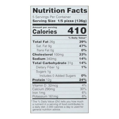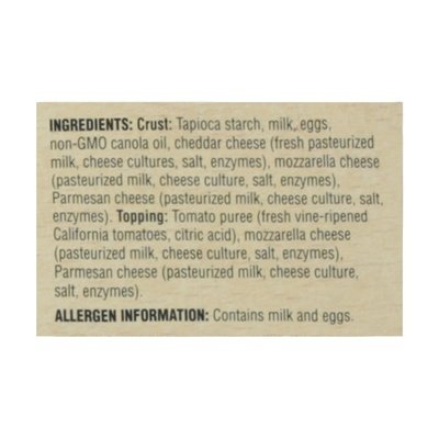 INGREDIENTS: Crust: Tapioca Starch, Milk, Eggs, Non-GMO Canola Oil, Cheddar Cheese (Fresh Pasteurized Milk, Cheese Cultures, Salt, Enzymes), Mozzarella Cheese (Pasteurized Milk, Cheese Culture, Salt, Enzymes), Parmesan Cheese (Pasteurized Milk, Cheese Culture, Salt, Enzymes), Topping: Tomato Puree (Fresh Vine-Ripened California Tomatoes, Citric Acid), Mozzarella Cheese (Pasteurized Milk, Cheese Culture, Salt, Enzymes), Parmesan Cheese (Pasteurized Milk, Cheese Culture, Salt, Enzymes).