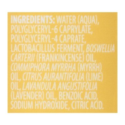 INGREDIENTS: Water (Aqua), Polyglyceryl-6 Caprylate, Polyglyceryl-4 Caprate, Lactobacillus Ferment, Boswellia Carterii (Frankincense) Oil, Commiphora Myrrha (Myrrh) Oil, Citrus Aurantifolia (Lime) Oil, Lavandula Angustifolia (Lavender) Oil, Benzoic Acid, Sodium Hydroxide, Citric Acid.