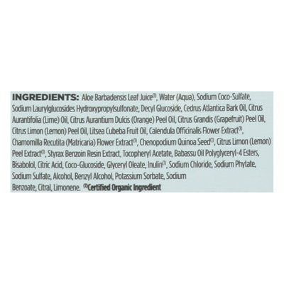 INGREDIENTS: Aloe Barbadensis Leaf Juice (Certified Organic Ingredient), Aqua (Water), Coco-Glucoside, Lauryl Glucoside, Sodium Coco-Sulfate, Sorbitol, Cedrus Atlantica Bark Oil, Citrus Aurantifolia (Lime) Oil, Citrus Aurantium Dulcis (Orange) Peel Oil, Citrus Limon (Lemon) Peel Oil, Citrus Grandis (Grapefruit) Peel Oil, Litsea Cubeba Fruit Oil, Calendula Officinalis Flower Oil Extract (Certified Organic Ingredient), Chamomilla Recutita (Matricaria) Flower Extract (Certified Organic Ingredient),Chenopodium Quinoa Seed (Certified Organic Ingredient), Citrus Limon (Lemon) Peel Extract (Certified Organic Ingredient), Styrax Benzoin Resin Extract, Tocopheryl Acetate, Babassu Oil Polyglyceryl-4 Esters, Bisabolol, Citric Acid, Decyl Glucoside, Inulin (Certified Organic Ingredient), Sodium Sulfate, Alcohol (Certified Organic Ingredient), Benzyl Alcohol, Potassium Sorbate, Sodium Benzoate, Citral, Limonene, Product is Preserved with Sodium Benzoate.