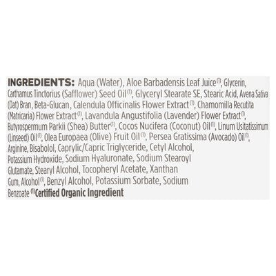 INGREDIENTS: Aqua (Water), Aloe Barbadensis Leaf Juice (Certified Organic Ingredient), Glycerin, Carthamus Tinctorius (Safflower) Seed Oil (Certified Organic Ingredient), Glyceryl Stearate SE, Stearic Acid, Avena Sativa (Oat) Bran, Beta-Glucan, Calendula Officinalis Flower Extract (Certified Organic Ingredient), Chamomilla Recutita (Matricaria) Flower Extract (Certified Organic Ingredient), Lavandula Angustifolia (Lavender) Flower Extract (Certified Organic Ingredient), Butyrospermum Parkii (Shea) Butter (Certified Organic Ingredient), Cocos Nucifera (Coconut) Oil (Certified Organic Ingredient), Linum Usitatissimum (Linseed) Oil (Certified Organic Ingredient), Olea Europaea (Olive) Fruit Oil (Certified Organic Ingredient), Persea Gratissima (Avocado) Oil (Certified Organic Ingredient), Arginine, Bisabolol, Caprylic/Capric Triglyceride, Cetyl Alcohol, Potassium Hydroxide, Sodium Hyaluronate, Sodium Stearoyl Glutamate, Stearyl Alcohol (Certified Organic Ingredient), Tocopheryl Acetate, Xanthan Gum, Alcohol, Benzyl Alcohol, Potassium Sorbate, Sodium Benzoate (Certified Organic Ingredient).