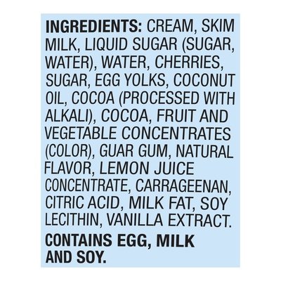 INGREDIENTS: Cream, Skim Milk, Liquid Sugar (Sugar, Water), Water, Cherries, Sugar, Egg Yolks, Coconut Oil, Cocoa (Processed with Alkali), Cocoa, Fruit and Vegetable Concentrates (Color), Guar Gum, Natural Flavor, Lemon Juice Concentrate, Carrageenan, Citric Acid, Milk Fat, Soy Lecithin, Vanilla Extract.