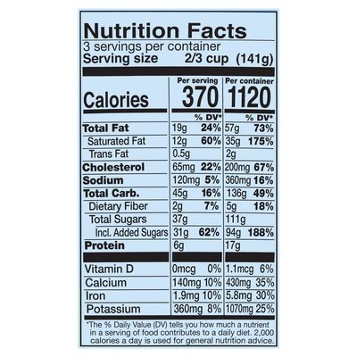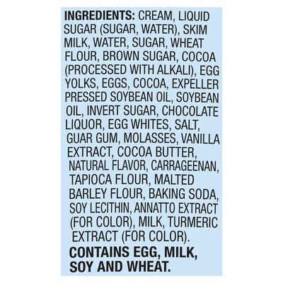 INGREDIENTS: Cream, Liquid Sugar (Sugar, Water), Skim Milk, Water, Sugar, Wheat Flour, Brown Sugar, Cocoa (Processed with Alkali), Egg Yolks, Eggs, Cocoa, Expeller Pressed Soybean Oil, Soybean Oil, Invert Sugar, Chocolate Liquor, Egg Whites, Salt, Guar Gum, Molasses, Vanilla Extract, Cocoa Butter, Natural Flavor, Carrageenan, Tapioca Flour, Malted Barley Flour, Baking Soda, Soy Lecithin, Annatto Extract (for Color), Milk, Turmeric Extract (for Color).