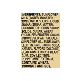INGREDIENTS: Sunflower Milk (Water, Roasted Sunflower Seeds), Liquid Sugar (Sugar, Water), Coconut Oil, Corn Syrup Solids, Sugar, Wheat Flour, Pea Protein, Cocoa (Processed with Alkali), Sunflower Oil, Sunflower Lecithin, Salt, Baking Soda, Natural Flavors (Coconut), Guar Gum, Locust Bean Gum, Soy Lecithin, Peppermint Extract.