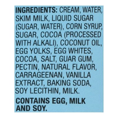 INGREDIENTS: Cream, Water, Skim Milk, Liquid Sugar (Sugar, Water), Corn Syrup, Sugar, Cocoa (Processed with Alkali), Coconut Oil, Egg Yolks, Egg Whites, R Cocoa, Salt, Guar Gum, Pectin, Natural Flavor, Carrageenan, Vanilla Extract, Baking Soda, Soy Lecithin, Milk.