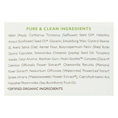 INGREDIENTS: Pure & Clean Ingredients: Water, Carthamus Tinctorius (Safflower) Seed Oil (Certified Organic Ingredients), Helianthus Annuus (Sunflower) Seed Oil (Certified Organic Ingredients), Glycerin, Emulsifying Wax, Glyceryl Stearate SE, Avena Sativa (Oat) Kernel Flour, Calendula Officinalis Flower Extract (Certified Organic Ingredients), Butyrospermum Parkii (Shea) Butter, Simmondsia Chinensis (Jojoba) Seed Oil, Tocopheryl Acetate, Cetyl Alcohol, Caprylhydroxamic Acid, Glyceryl Caprylate, Chamomilla Recutita (Matricaria) Flower Extract (Certified Organic Ingredients), Nasturtium Officinale (Watercress) Flower/Leaf Extract (Certified Organic Ingredients), Pueraria Lobata (Kudzu) Root Extract (Certified Organic Ingredients), Spiraea Ulmaria (Meadowsweet) Flower Extract (Certified Organic Ingredients), Xanthan Gum, Hippophae Rhamnoides (Sea Buckthorn) Oil.