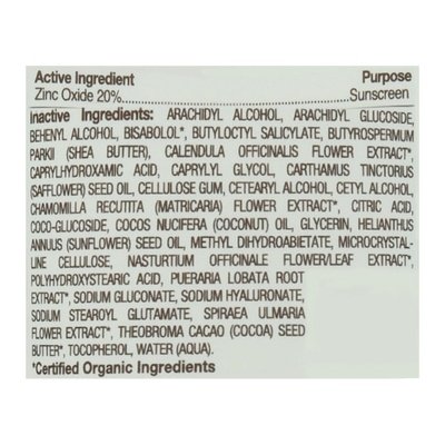 INGREDIENTS: Active Ingredients: Zinc Oxide (20 %), Sunscreen. Inactive Ingredients: Arachidyl Alcohol, Arachidyl Glucoside, Behenyl Alcohol, Bisabolol (Certified Organic Ingredients), Butyloctyl Salicylate, Butyrospermum Parkii (Shea) Butter, Calendula Officinalis Flower Extract (Certified Organic Ingredients), Caprylhydroxamic Acid, Caprylyl Glycol, Carthamus Tinctorius (Safflower) Seed Oil, Cellulose Gum, Cetearyl Alcohol, Cetyl Alcohol, Chamomilla Recutita (Matricaria) Flower Extract (Certified Organic Ingredients), Citric Acid, Coco-Glucoside, Cocos Nucifera (Coconut) Oil, Glycerin, Helianthus Annuus (Sunflower) Seed Oil, Methyl Dihydroabietate, Microcrystalline Cellulose, Nasturtium Officinale Flower/Leaf Extract (Certified Organic Ingredients), Polyhydroxystearic Acid, Pueraria Lobata Root Extract (Certified Organic Ingredients), Sodium Gluconate, Sodium Hyaluronate, Sodium Stearoyl Glutamate, Spiraea Ulmaria Flower Extract (Certified Organic Ingredients), Theobroma Cacao (Cocoa) Seed Butter (Certified Organic Ingredients), Tocopherol, Water (Aqua).