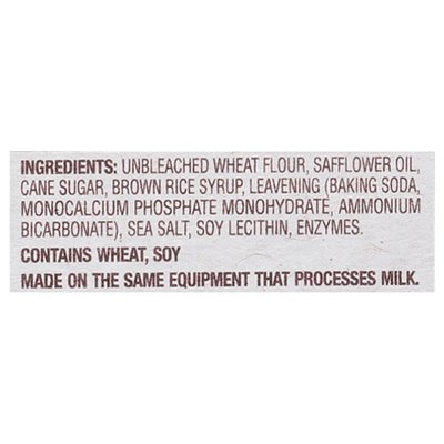 INGREDIENTS: Unbleached Wheat Flour, Safflower Oil, Cane Sugar, Brown Rice Syrup, Leavening (Baking Soda, Monocalcium Phosphate Monohydrate, Ammonium Bicarbonate), Sea Salt, Soy Lecithin, Enzymes.