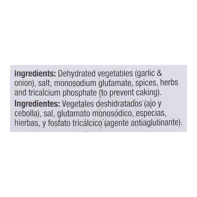 INGREDIENTS: Dehydrated Vegetables (Garlic & Onion), Salt, Monosodium Glutamate, Spices, Herbs and Tricalcium Phosphate (to Prevent Caking).