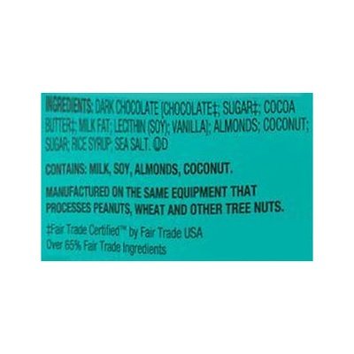 INGREDIENTS: Dark Chocolate (Chocolate (Fair Trade Certified by Fair Trade USA Over 65% Fair Trade Ingredients), Sugar (Fair Trade Certified by Fair Trade USA), Cocoa Butter (Fair Trade Certified by Fair Trade USA Over 65% Fair Trade Ingredients), Milk Fat; Lecithin (Soy), Vanilla), Almonds, Coconut, Sugar, Rice Syrup, Sea Salt.