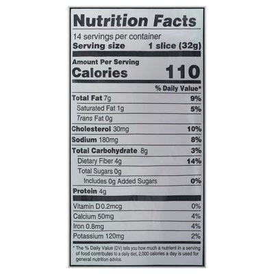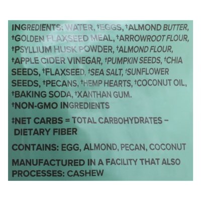 INGREDIENTS: Water, Eggs (Non-GMO Ingredients), Almond Butter (Non-GMO Ingredients), Golden Flaxseed Meal (Non-GMO Ingredients), Arrowroot Flour (Non-GMO Ingredients), Psyllium Husk Powder (Non-GMO Ingredients), Almond Flour (Non-GMO Ingredients), Apple Cider Vinegar (Non-GMO Ingredients), Pumpkin Seeds (Non-GMO Ingredients), Chia Seeds (Non-GMO Ingredients), Flaxseed (Non-GMO Ingredients), Sea Salt (Non-GMO Ingredients), Sunflower Seeds (Non-GMO Ingredients), Pecans (Non-GMO Ingredients), Hemp Hearts (Non-GMO Ingredients), Coconut Oil (Non-GMO Ingredients), Baking Soda (Non-GMO Ingredients), Xanthan Gum (Non-GMO Ingredients).