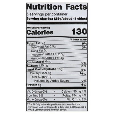 PRODUCT DETAILS: 4 g plant-based protein per serving. 4 g fiber (Contains 7 g total fat per serving. See nutrition information for fat content) per serving. Certified gluten free. gfco.org. Non-GMO Project verified. nongmoproject.org. Born in Austin and grown on family farms. Beans are better. Born in Austin, TX in 2010, an intrepid group of adventurers in Austin, TX invented the first-ever bean tortilla chip. From day 1, our chips have celebrated the nutritional power of beans, and that bold Texan flavor. Giddy up! Grown on local family farms we are passionate about regenerative agriculture and working with domestic family farms. The beans in this bag were grown by our farm-partners in Michigan, North Dakota and Nebraska! The result. Our tortilla chips are light, crispy and dip worthy! They are a source of plant-based protein, contain 4 g of fiber, and only 11 g of net carbs (15 g total carbs - 4 g fiber = 11 g total carbs) per serving! beanitos.com. Let's connect beanitos.com. Instagram (at)BeanitosChips. Facebook (at)Beanitos.