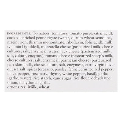 INGREDIENTS: Tomatoes (Tomatoes, Tomato Puree, Citric Acid), Cooked Enriched Penne Rigate (Water, Durum Wheat Semolina, Niacin, Iron, Thiamin Mononitrate, Riboflavin, Folic Acid), Milk (Vitamin D3 Added), Mozzarella Cheese (Pasteurized Milk, Cheese Cultures, Salt, Enzymes), Water, Jack Cheese (Pasteurized Milk, Salt, Culture, Enzymes), Romano Cheese (Pasteurized Sheep's Milk, Cheese Cultures, Salt, Enzymes), Parmesan Cheese (Pasteurized Part-Skim Milk, Cheese Culture, Salt, Enzymes), Extra Virgin Olive Oil, Sea Salt, Spices (Oregano, Parsley, Fennel, Crushed Red Pepper, Black Pepper, Rosemary, Thyme, White Pepper, Basil), Garlic (Garlic, Water), Rice Starch, Cane Sugar, Rice Flour, Dehydrated Onion, Dehydrated Garlic.