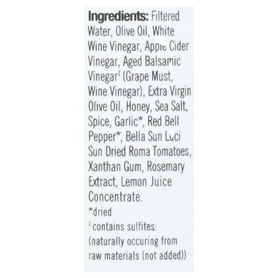 INGREDIENTS: Filtered Water, Olive Oil, White Wine Vinegar, Apple Cider Vinegar, Aged Balsamic Vinegar (Contains Sulfites: (Naturally Occuring from Raw Materials (Not Added)) (Grape Must, Wine Vinegar), Extra Virgin Olive Oil, Honey, Sea Salt, Spice, Garlic(Dried), Red Bell Pepper(Dried), Bella Sun Luci Sun Dried Roma Tomatoes, Xanthan Gum, Rosemary Extract, Lemon Juice Concentrate.