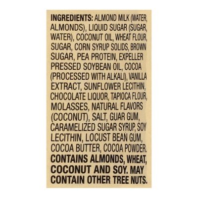INGREDIENTS: Almond Milk (Water, Almonds), Liquid Sugar (Sugar, Water), Coconut Oil, Wheat Flour, Corn Syrup Solids, Brown Sugar, Corn Syrup Solids, Brown Sugar, Pea Protein, Expeller Pressed Soybean Oil, Cocoa (Processed with Alkali), Vanilla Extract, Sunflower Lecithin, Chocolate Liquor, Tapioca Flour, Molasses, Natural Flour, Molasses, Natural Flavors (Coconut), Salt, Sugar Gum, Caramelized Sugar Syrup, Soy Lecithin, Locust Bean Gum, Cocoa Butter, Cocoa Powder.