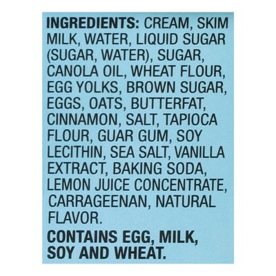 INGREDIENTS: Cream, Skim Milk, Water, Liquid Sugar (Sugar, Water), Sugar, Canola Oil, Wheat Flour, Egg Yolks, Brown Sugar, Eggs, Oats, Butterfat, Cinnamon, Salt, Tapioca Flour, Guar Gum, Soy Lecithin, Sea Salt, Vanilla Extract, Baking Soda, Lemon Juice Concentrate, Carrageenan, Natural Flavor.