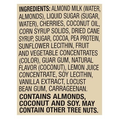 INGREDIENTS:  Almond Milk (Water, Almonds), Liquid Sugar (Sugar, Water), Cherries, Coconut Oil, Corn Syrup Solids, Dried Cane Syrup, Sugar, Cocoa, Pea Protein, Sunflower Lecithin, Fruit and Vegetable Concentrates (Color), Guar Gum, Natural Flavor (Coconut), Lemon Juice Concentrate, Soy Lecithin, Vanilla Extract, Locust Bean Gum, Carrageenan.