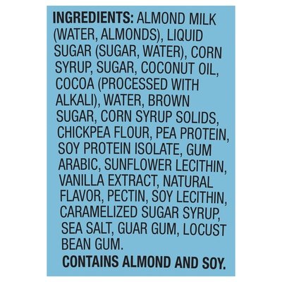 INGREDIENTS: Almond Milk (Water, Almonds), Liquid Sugar (Sugar, Water), Corn Syrup, Sugar, Coconut Oil, Cocoa (Processed with Alkali), Water, Brown Sugar, Corn Syrup Solids, Chickpea Flour, Pea Protein, Soy Protein Isolate, Gum Arabic, Sunflower Lecithin, Vanilla Extract, Natural Flavor, Pectin, Soy Lecithin, Caramelized Sugar Syrup, Sea Salt, Guar Gum, Locust Bean Gum.