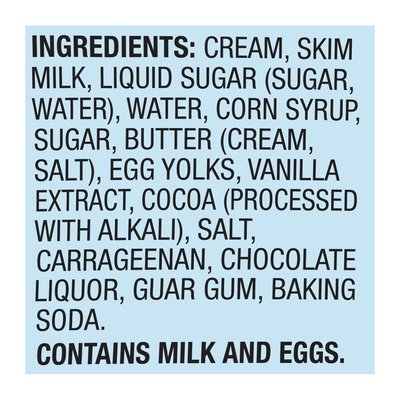 INGREDIENTS: Cream, Skim Milk, Liquid Sugar (Sugar, Water), Water, Corn Syrup, Sugar, Butter (Cream Salt), Egg Yolks, Vanilla Extract, Cocoa (Processed with Alkali), Salt, Carrageenan, Chocolate Liquor, Guar Gum, Baking Soda.