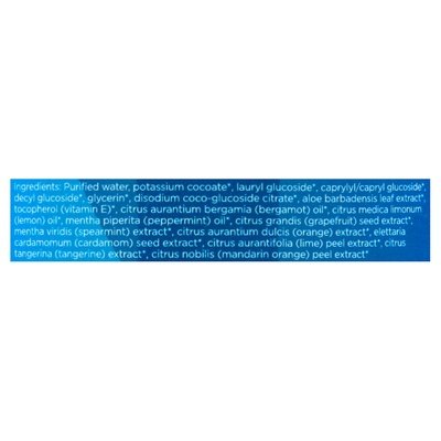 INGREDIENTS: Purified Water, Potassium Cocoate (Denotes Plant- or Mineral-Derived), Lauryl Glucoside (Denotes Plant- or Mineral-Derived), Caprylyl/Capryl Glucoside (Denotes Plant- or Mineral-Derived), Decyl Glucoside (Denotes Plant- or Mineral-Derived), Glycerin (Denotes Plant- or Mineral-Derived), Disodium Coco-Glucoside Citrate (Denotes Plant- or Mineral-Derived), Aloe Barbadensis Leaf Extract (Denotes Plant- or Mineral-Derived), Tocopherol (Vitamin E) (Denotes Plant- or Mineral-Derived), Citrus Aurantium Bergamia (Bergamot) Oil (Denotes Plant- or Mineral-Derived), Citrus Medica Limonium (Lemon) Oil (Denotes Plant- or Mineral-Derived), Mentha Piperita (Peppermint) Oil (Denotes Plant- or Mineral-Derived), Citrus Grandis (Grapefruit) Seed Extract (Denotes Plant- or Mineral-Derived), Mentha Viridis (Spearmint) Extract (Denotes Plant- or Mineral-Derived), Citrus Aurantium Dulcis (Orange) Extract (Denotes Plant- or Mineral-Derived), Elettaria Cardamomum (Cardamom) Seed Extract (Denotes Plant- or Mineral-Derived), Citrus Aurantifolia (Lime) Peel Extract (Denotes Plant- or Mineral-Derived), Citrus Tangerina (Tangerine) Extract (Denotes Plant- or Mineral-Derived), Citrus Nobilis (Mandarin Orange) Peel Extract (Denotes Plant- or Mineral-Derived).