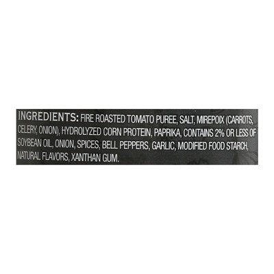 INGREDIENTS: Fire Roasted Tomato Puree, Salt, Mirepoix (Carrots, Celery, Onion), Hydrolyzed Corn Protein, Paprika, Contains 2% or Less of Soybean Oil, Onion, Spices, Bell Peppers, Garlic, Modified Food Starch, Natural Flavors, Xanthan Gum.