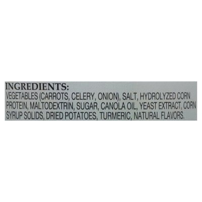 INGREDIENTS: Vegetables (Carrots, Celery, Onion), Salt, Hydrolyzed Corn Protein, Maltodextrin, Sugar, Canola Oil, Yeast Extract, Corn Syrup Solids, Dried Potatoes, Turmeric, Natural Flavors.