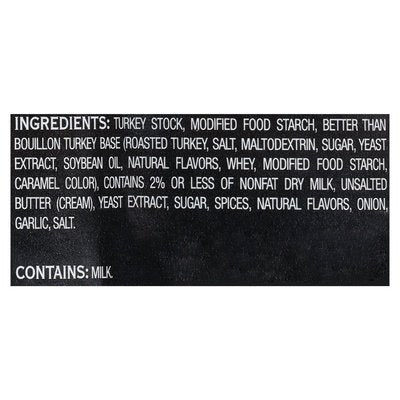 INGREDIENTS: Turkey Stock, Modified Food Starch, Better than Bouillon Turkey Base (Roasted Turkey, Salt, Maltodextrin, Sugar, Yeast Extract, Soybean Oil, Natural Flavors, Whey, Modified Food Starch, Caramel Color), Contains 2% or Less of Nonfat Dry Milk, Unsalted Butter (Cream), Yeast Extract, Sugar, Spices, Natural Flavors, Onion, Garlic, Salt.