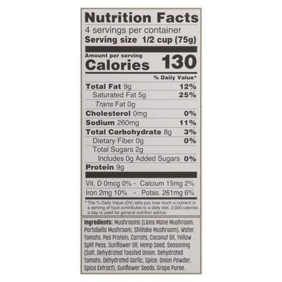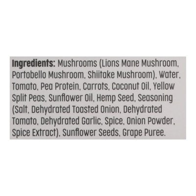 INGREDIENTS: Mushrooms (Lions Mane Mushroom, Portobello Mushroom, Shiitake Mushroom), Water, Tomato, Pea Protein, Carrots, Coconut Oil, Yellow Split Peas, Sunflower Oil, Hemp Seed, Seasoning (Salt, Dehydrated Toasted Onion, Dehydrated Tomato, Dehydrated Garlic, Spice, Onion Powder, Spice Extract), Sunflower Seeds, Grape Puree.