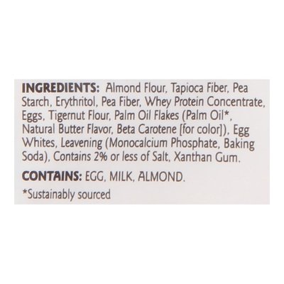 INGREDIENTS: Almond Flour, Eggs, Tigernut Flour, Organic Coconut Flour, Cassava Starch, Buttermilk, Leavening (Monocalcium Phosphate, Sodium Bicarbonate), Salt, Spice.