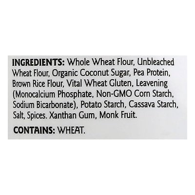 INGREDIENTS: Whole Wheat Flour, Unbleached Wheat Flour, Coconut Sugar, Pea Protein, Brown Rice Flour, Vital Wheat Gluten, Leavening (Monocalcium Phosphate, Non-GMO Corn Starch, Sodium Bicarbonate), Potato Starch, Cassava Starch, Salt, Spices, Xanthan Gum, Monk Fruit.