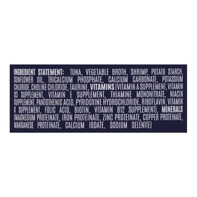 INGREDIENTS: Ingredient Statement: Tuna, Vegetable Broth, Shrimp, Potato Starch, Sunflower Oil, Tricalcium Phosphate, Calcium Carbonate, Potassium Chloride, Choline Chloride, Taurine, (Vitamin A Supplement, Vitamin D3 Supplement, Vitamin E Supplement, Thiamine Mononitrate, Niacin Supplement, Pantothenic Acid, Pyridoxine Hydrochloride, Riboflavin, Vitamin K Supplement, Folic Acid, Biotin, Vitamin B12 Supplement), Minerals (Magnesium Proteinate, Iron Proteinate, Zinc Proteinate, Copper Proteinate, Manganese Proteinate, Calcium Iodate, Sodium Selenite).