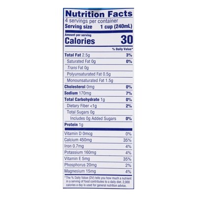 INGREDIENTS: Almondmilk (Filtered Water, Almonds), Calcium Carbonate, Natural Flavors, Sea Salt, Potassium Citrate, Sunflower Lecithin, Gellan Gum, D-Alpha-Tocopherol (Natural Vitamin E).