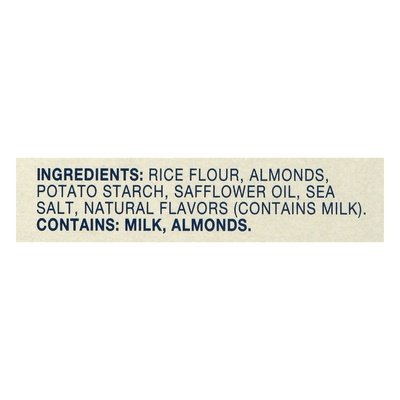 INGREDIENTS: Rice Flour, Almonds, Potato Starch, Safflower Oil, Sea Salt, Natural Flavors (Contains Milk).