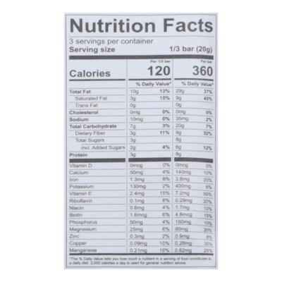 INGREDIENTS: Whole Cacao Blend (100% Chocolate (Organic), Cacao Shell Flour, Cacao Butter (Organic), Cacao Sugar), Almond Butter (Organic), Almonds (Organic), Coconut Sugar (Organic), Sea Salt.