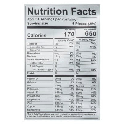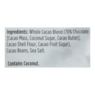 INGREDIENTS: Whole Cacao Blend (70% Chocolate [Cacao Mass, Coconut Sugar, Cacao Butter], Cacao Shell Flour, Cacao Fruit Sugar), Cacao Beans, Sea Salt.
