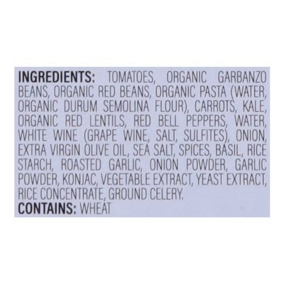 INGREDIENTS: Tomatoes, Organic Garbanzo Beans, Organic Red Beans, Organic Pasta (Water, Organic Durum Semolina Flour), Carrots, Kale, Organic Red Lentils, Red Bell Peppers, Water, White Wine (Grape Wine, Salt, Sulfites), Onion, Extra Virgin Olive Oil, Sea Salt, Spices, Basil, Rice Starch, Roasted Garlic, Onion Powder, Garlic Powder, Konjac, Vegetable Extract, Yeast Extract, Rice Concentrate, Ground Celery.
