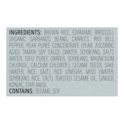 INGREDIENTS: Brown Rice, Edamame, Broccoli, Organic Garbanzo Beans, Carrots, Red Bell Pepper, Pear Puree Concentrate (Pear, Ascorbic Acid), Tamari Soy Sauce (Water, Soybeans, Salt), Water, Tofu Puree (Water, Soybeans, Magnesium Chloride, Calcium Chloride), Sesame Seeds, Sake (Water, Rice, Salt), Rice Vinegar, Miso (Water, Soybeans, Rice, Salt), Toasted Sesame Oil, Ginger, Konjac, Star Anise.