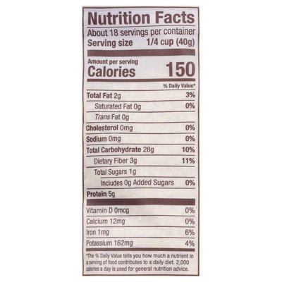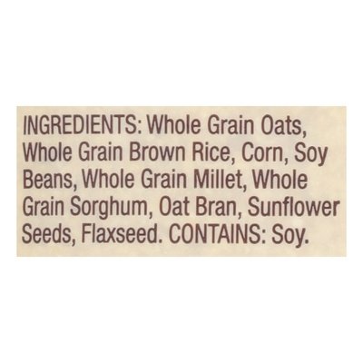 INGREDIENTS: Whole Grain Oats, Whole Grain Brown Rice, Corn, Soy Beans, Whole Grain Millet, Whole Grain Sorghum, Oat Bran, Sunflower Seeds, Flaxseed.