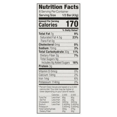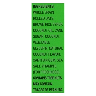 INGREDIENTS: Organic Whole Grain Rolled Oats, Brown Rice Syrup, Organic Coconut Oil, Organic Cane Sugar, Coconut, Vegetable Glycerin, Natural Coconut Flavor, Xanthan Gum, Sea Salt, Vitamin E (for Freshness).