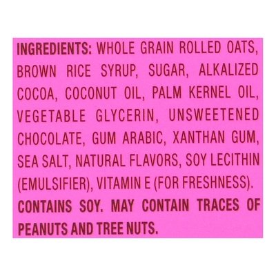 INGREDIENTS: Whole Grain Rolled Oats, Brown Rice Syrup, Sugar, Alkalized Cocoa, Coconut Oil, Palm Kernel Oil, Vegetable Glycerin, Unsweetened Chocolate, Gum Arabic, Xanthan Gum, Sea Salt, Natural Flavors, Soy Lecithin (Emulsifier), Vitamin E (for Freshness).