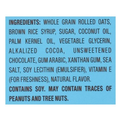 INGREDIENTS: Whole Grain Rolled Oats, Brown Rice Syrup, Sugar, Coconut Oil, Palm Kernel Oil, Vegetable Glycerin, Alkalized Cocoa, Unsweetened Chocolate, Gum Arabic, Xanthan Gum, Sea Salt, Soy Lecithin (Emulsifier), Vitamin E (for Freshness), Natural Flavor.