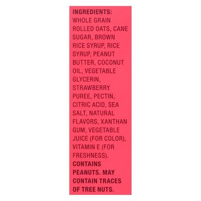 DESCRIPTION: Soft baked peanut butter oat crust with strawberry filling. 17 g whole grains per serving. Whole Grain: 17 g or more per serving. Eat 48 g or more of whole grains daily. WholeGrainsCouncil.org. Certified gluten free. Dairy-free. Vegan. Non-GMO Project verified. nongmoproject.org. New! Baked with Love: Since 2003, our Colorado bakery has dreamed up yummy oat bar recipes using wholesome simple ingredients. One day, we thought, what if we re-imagine the traditional Peanut Butter and Jelly sandwich?! Bobo's could make one that isn't messy and easy to take anywhere, and we'll replace the bread with a totally gluten-free, nutrient dense, peanut-buttery oat crust! Voila, 'PB&Js' were born! From My Family to Yours - I started baking with my daughter "Bobo" in our home kitchen in 2003. All these years later my goal is the same - to make Bobo's taste like homemade treats while using simple, delicious ingredients that warm your heart and home! When I began Bobo's many years ago, our community was so important to our success. As Bobo's has grown, one of our core values has remained - for us to treat our people, planet and community with love! Love, Beryl. Plant-based. eatbobos.com. See what's bakin' on social! Instagram. Facebook. Twitter. (at)eatbobos. Learn more at eatbobos.com/family. We welcome your questions and comments: eatbobos.com; info(at)eatbobos.com. Check out all of our delicious gluten-free treats at eatbobos.com. < Whole Grain Rolled Oats, Cane Sugar, Brown Rice Syrup, Rice Syrup, Peanut Butter, Coconut Oil, Vegetable Glycerin, Strawberry Puree, Pectin, Citric Acid, Sea Salt, Natural Flavors, Xanthan Gum, Vegetable Juice (for Color), Vitamin E (for Freshness).