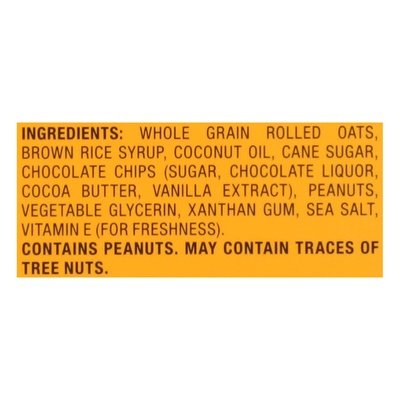 INGREDIENTS: Whole Grain Rolled Oats, Brown Rice Syrup, Coconut Oil, Cane Sugar, Chocolate Chips (Sugar, Chocolate Liquor, Cocoa Butter, Vanilla Extract), Peanuts, Vegetable Glycerin, Xanthan Gum, Sea Salt, Vitamin E (for Freshness).