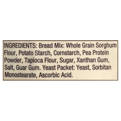 INGREDIENTS: Bread Mix: Whole Grain Sorghum Flour, Potato Starch, Cornstarch, Pea Protein Powder, Tapioca Flour, Sugar, Xanthan Gum, Salt, Guar Gum, Yeast Packet: Yeast, Sorbitan Monostearate, Ascorbic Acid.