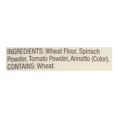 INGREDIENTS: Wheat Flour, Spinach Powder, Tomato Powder, Annatto (Color).