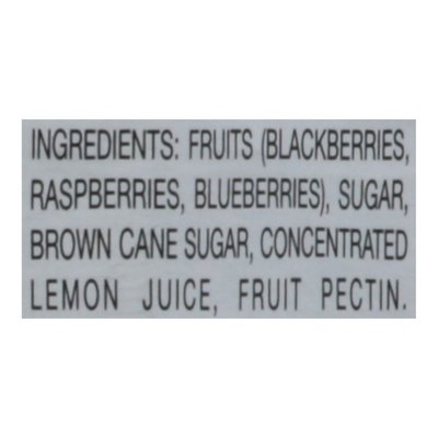 INGREDIENTS: Fruits (Blackberries, Raspberries, Blueberries), Sugar, Brown Cane Sugar, Concentrated Lemon Juice, Fruit Pectin.
