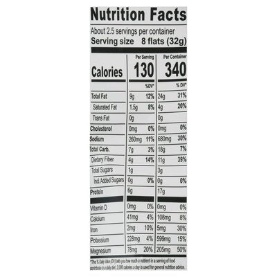 PRODUCT DETAILS: Made with real veggies. 11g fiber per bag. 17g protein per bag. USDA organic. Certified Organic by CCOF. Vegan.Certified GF-Gluten free. How can a snack this irresistible deliver all these benefits? Good source of fiber. 6 Germs plant protein. No grains, flours or starches. No cholesterol. Good source of magnesium. Gluten free. Only 130 calories per serving. Keto friendly. Certified Organic CCOF. Organic is non-GMO & more. Plant powered snack. Cauliflower. Chickpeas. Pumpkin seeds. Snack with Purpose: Brad's Plant Based is on a mission to revolutionize snacking with delicious plant-based options. Recharge your body and reap the benefits of 100% plant-based snacks. Not only do Brad's Veggie Flats deliver the nutritional power of organic plants, but they're downright tasty - crunchy, savory, and satisfying. Try them on their own or with dips and spreads, and know you're eating right. The Power of Plants: At Brad's, we believe that eating plants is good for our health and our planet. We air dry naturally nutritious plants in these scrumptious snacks that you can feel great about enjoying. Net carbs equals total carbs minus fiber. Air dried nutrient dense. bradsplantbased.com. Facebook. Twitter. Instagram. (at)BradsPlantBased. Bucks county, USA
