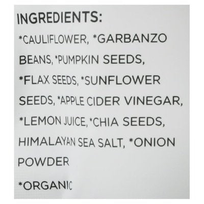 INGREDIENTS: (Organic) Cauliflower, (Organic) Garbanzo Beans, (Organic) Pumpkin Seeds, (Organic) Flax Seeds, (Organic) Sunflower Seeds, (Organic) Apple Cider Vinegar, (Organic) Lemon Juice, (Organic) Chia Seeds, Himalayan Sea Salt, (Organic) Onion Powder.